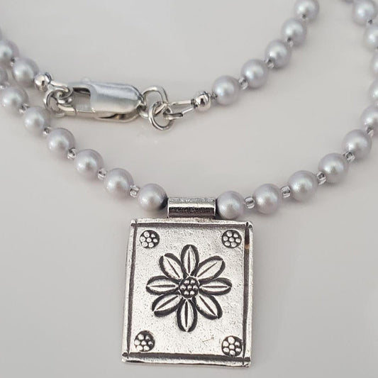 Timeless Gray Pearl Necklace with Sterling Silver Floral Pendant
