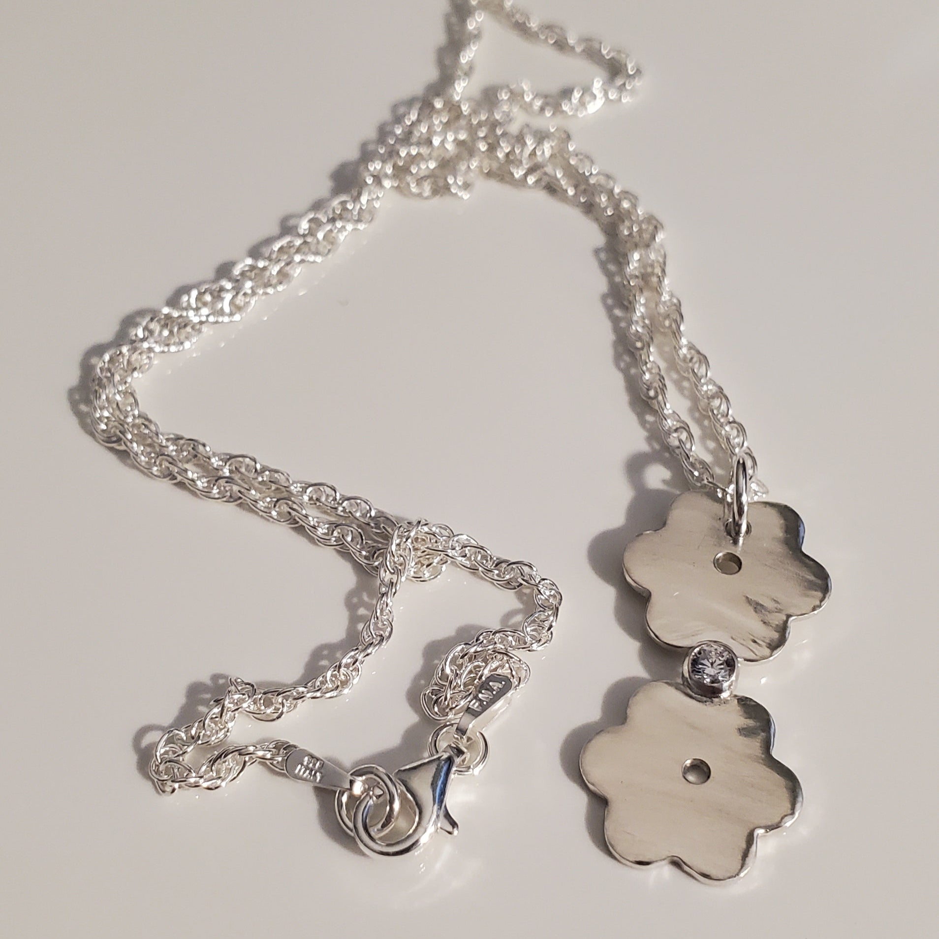 Suspended from an 18” sterling silver wheat chain, the ¾” daisies dangle gracefully, creating a necklace that feels playful yet refined.