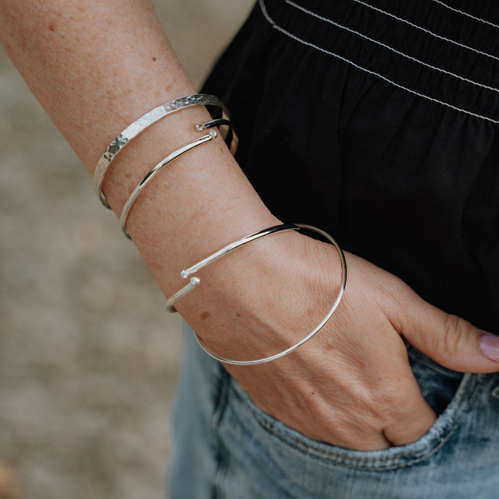 Crafted from solid 8-gauge sterling silver with a half-round profile, this adjustable cuff offers a beautifully balanced mix of strength and softness — much like the woman who wears it.