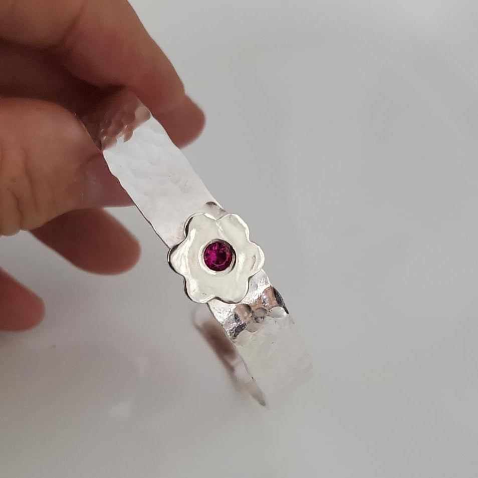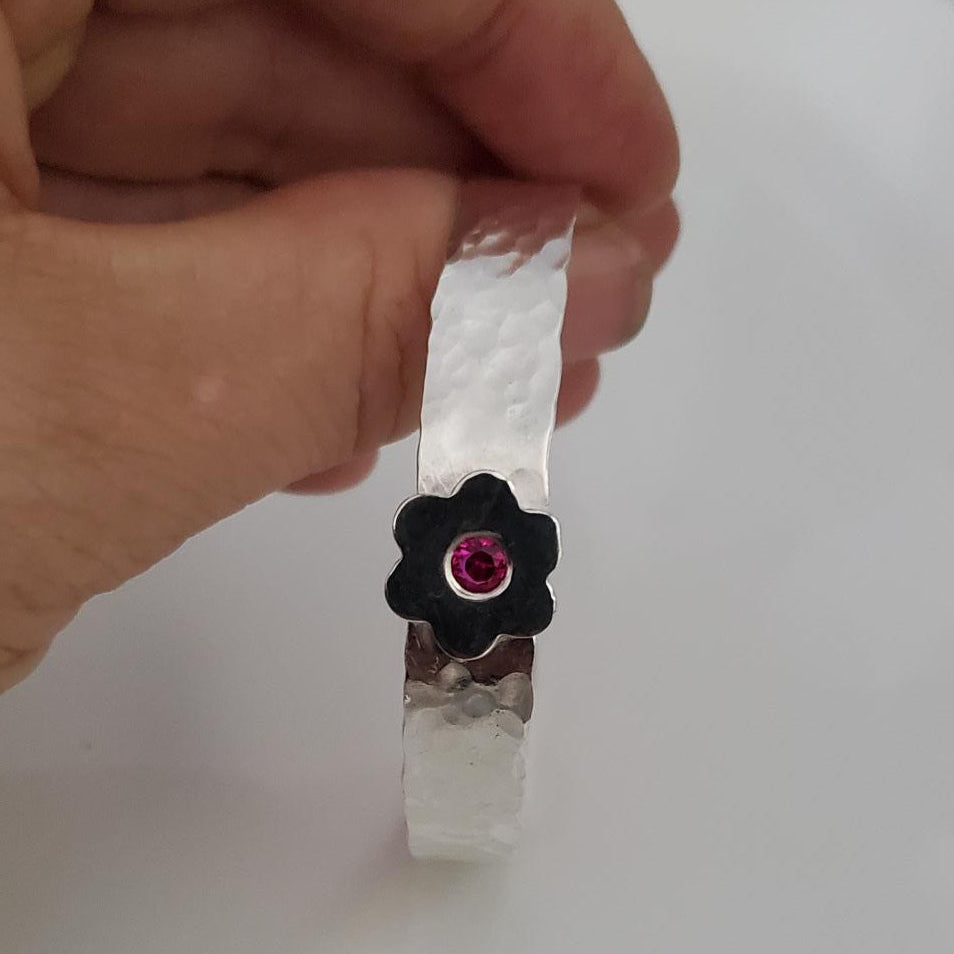 At its heart, a delicate sterling silver flower is flush-set with a 4mm London Blue Topaz gemstone or a 4mm ruby. London Blue Topaz, its deep ocean-blue hue symbolizing clarity, calm, and resilience. Ruby, with its vibrant color symbolizes the sun and has been called the inextinguishable flame possessing rare energy.